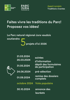 En 2024, le Parc Jura vaudois lance un appel à projets sur les traditions vivantes. Il vise à soutenir les idées fédératrices contribuant à la valorisation et à la transmission du patrimoine culturel immatériel sur son territoire, d'ici 2026.