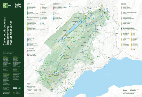 > La carte de découvertes du Parc Jura vaudois est disponible gratuitement dans les offices du tourisme qui se trouvent dans le périmètre et à l'entrée des bureaux du Parc, à Saint-George.